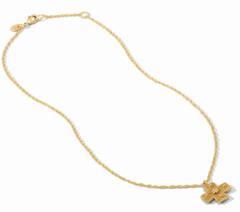 A hand-hammered cross pendant with golden bead accents and a shape which recalls early medieval crosses from England to Byzantium.
