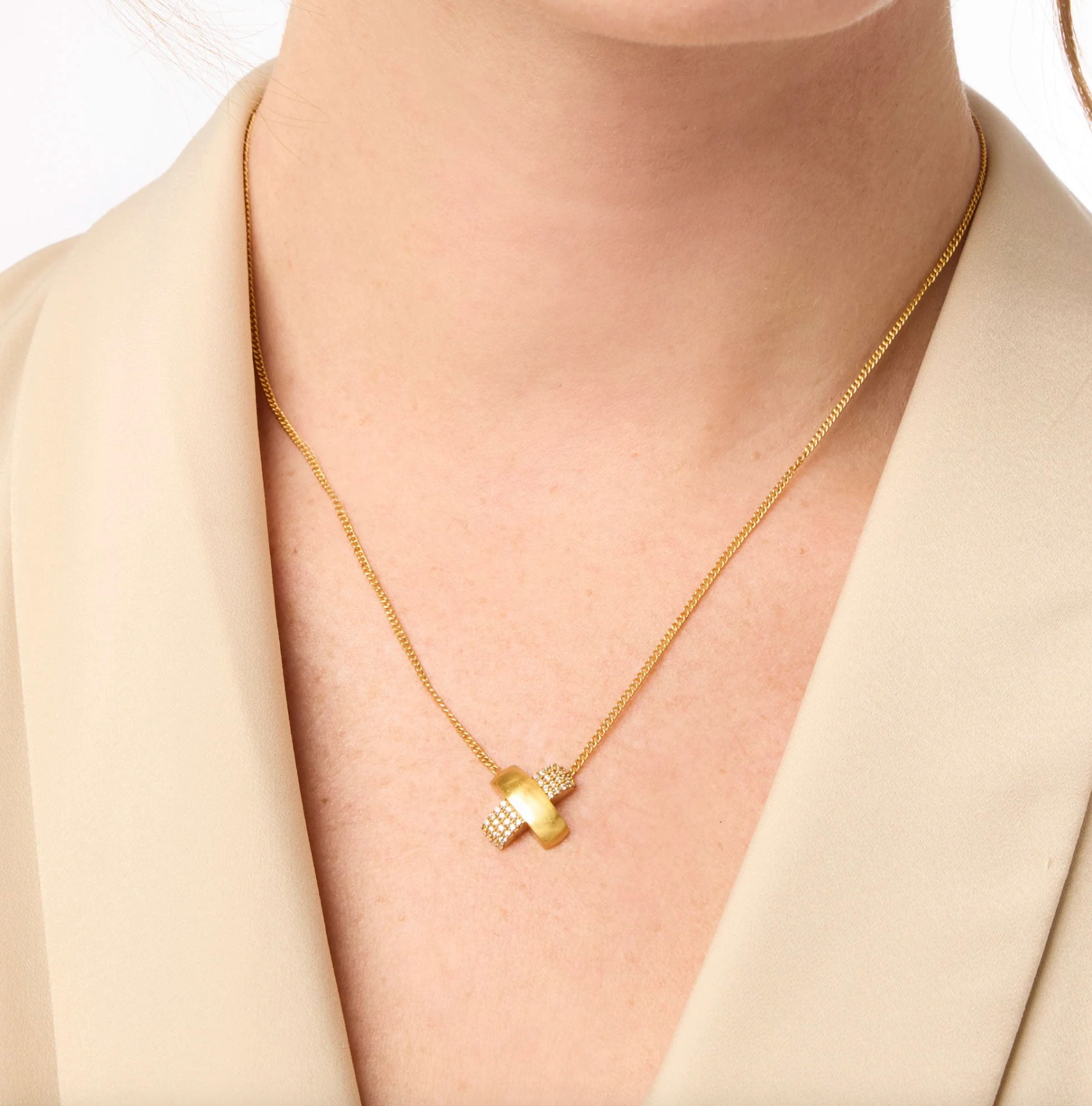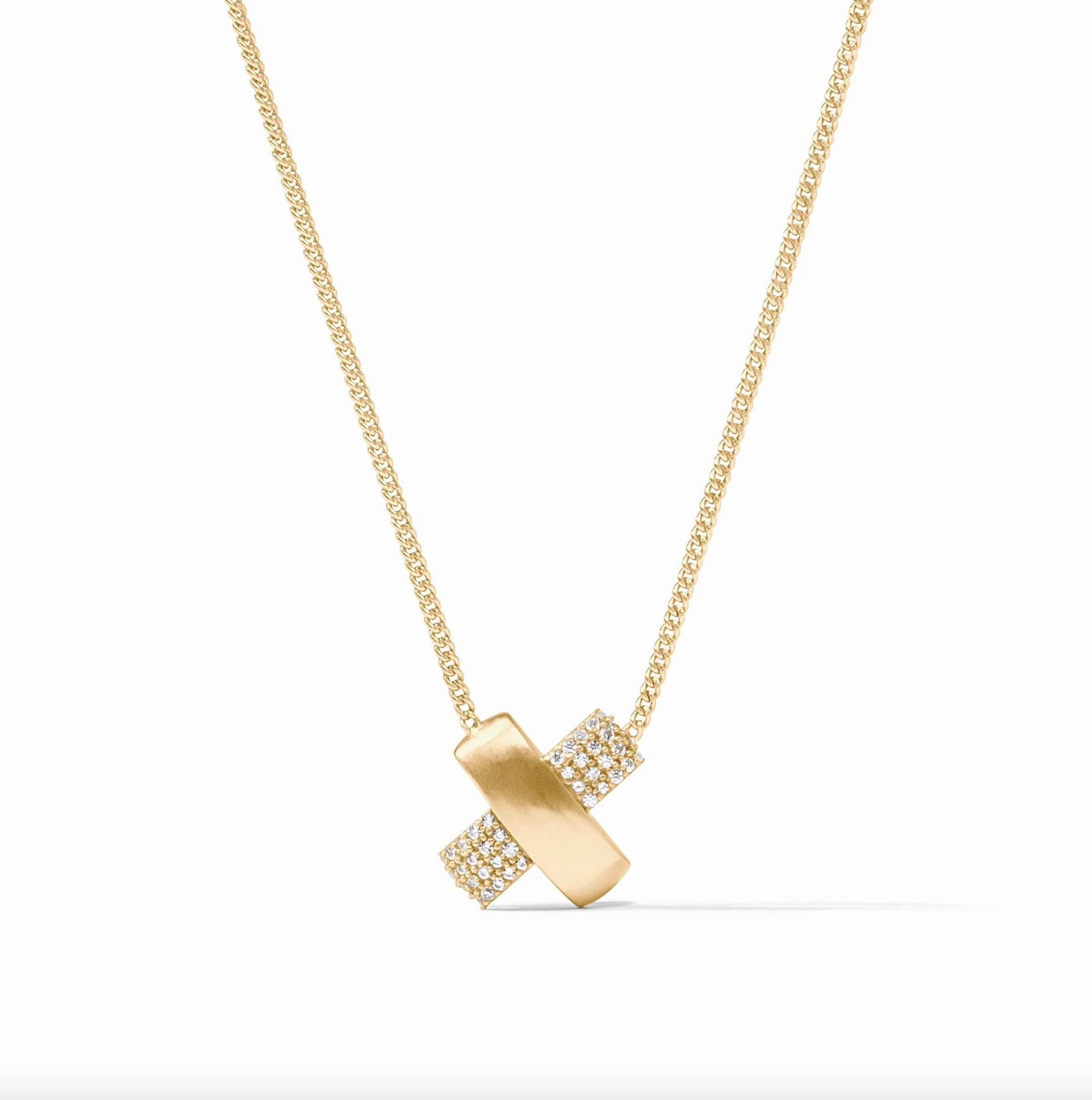 This necklace brings a true X-factor, with one golden bar with a smooth satin finish overlapping another encrusted in glittering pavé for a cross between edgy and elegant, finished with a delicate, adjustable curb chain.