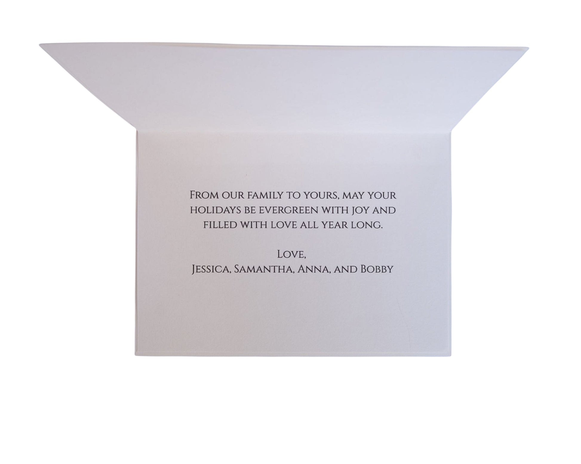 What’s Included: 10 embossed photo cards,10 hand-lined envelopes, printing and insertion of your selected 4" x 6" photo into every card, and your custom personal message (up to 200 characters) printed inside in our signature font