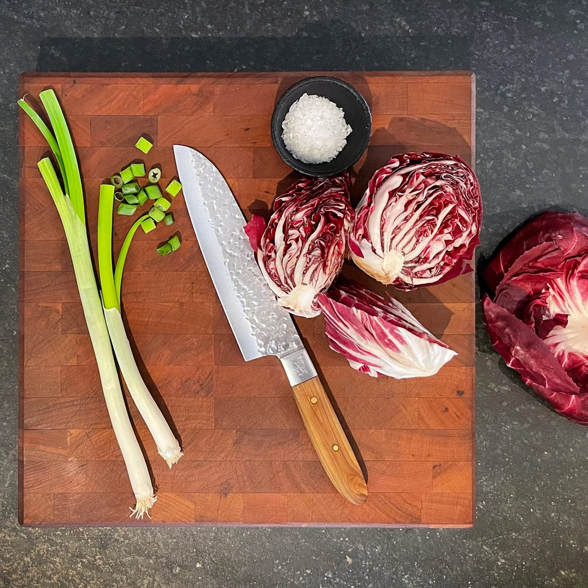 Our Professional End Grain Cherry Board is a 12" x 12" chopping board. End grain boards are chef favorites for their ability to keep a knife's edge sharp. The smaller 12"x12" size is a great fit in a small kitchen for all of your chopping, slicing and dicing needs. This board weighs 8.5 lbs.