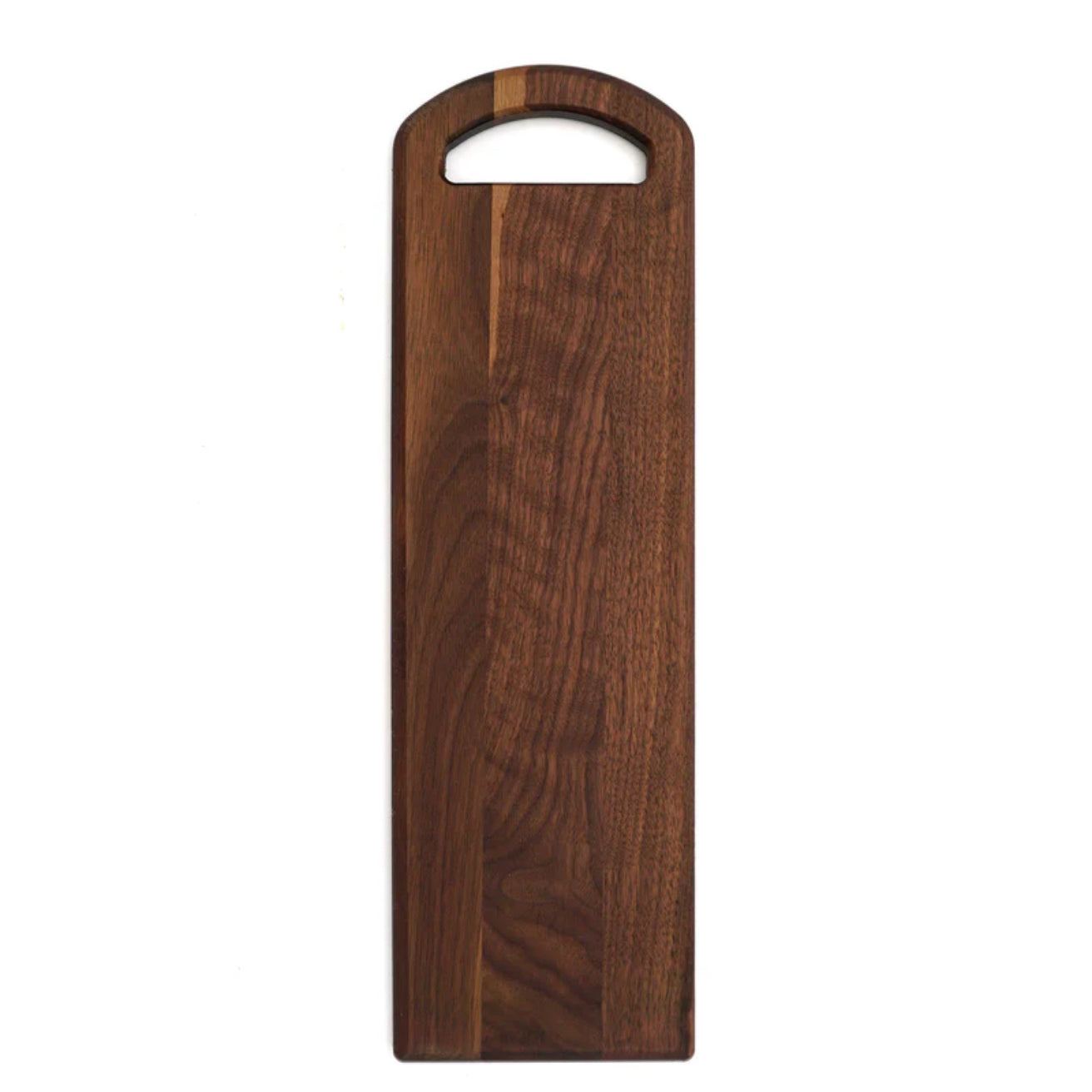 Our Walnut Wooden Serving Board has a beautiful and comfortable oval handle. The long thin shape of the board is perfect for serving appetizers, crostini, and bread. The dark rich color of the walnut makes a striking compliment to most kitchen decor.