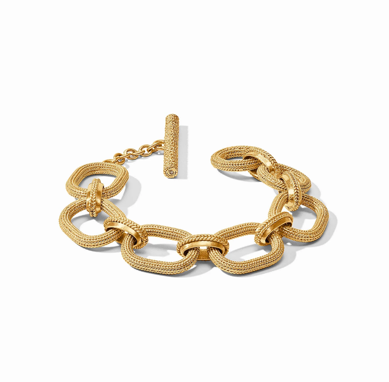 Oval links textured with braided golden wire, connected with smooth links embellished with an additional braid and closing with a matching toggle.