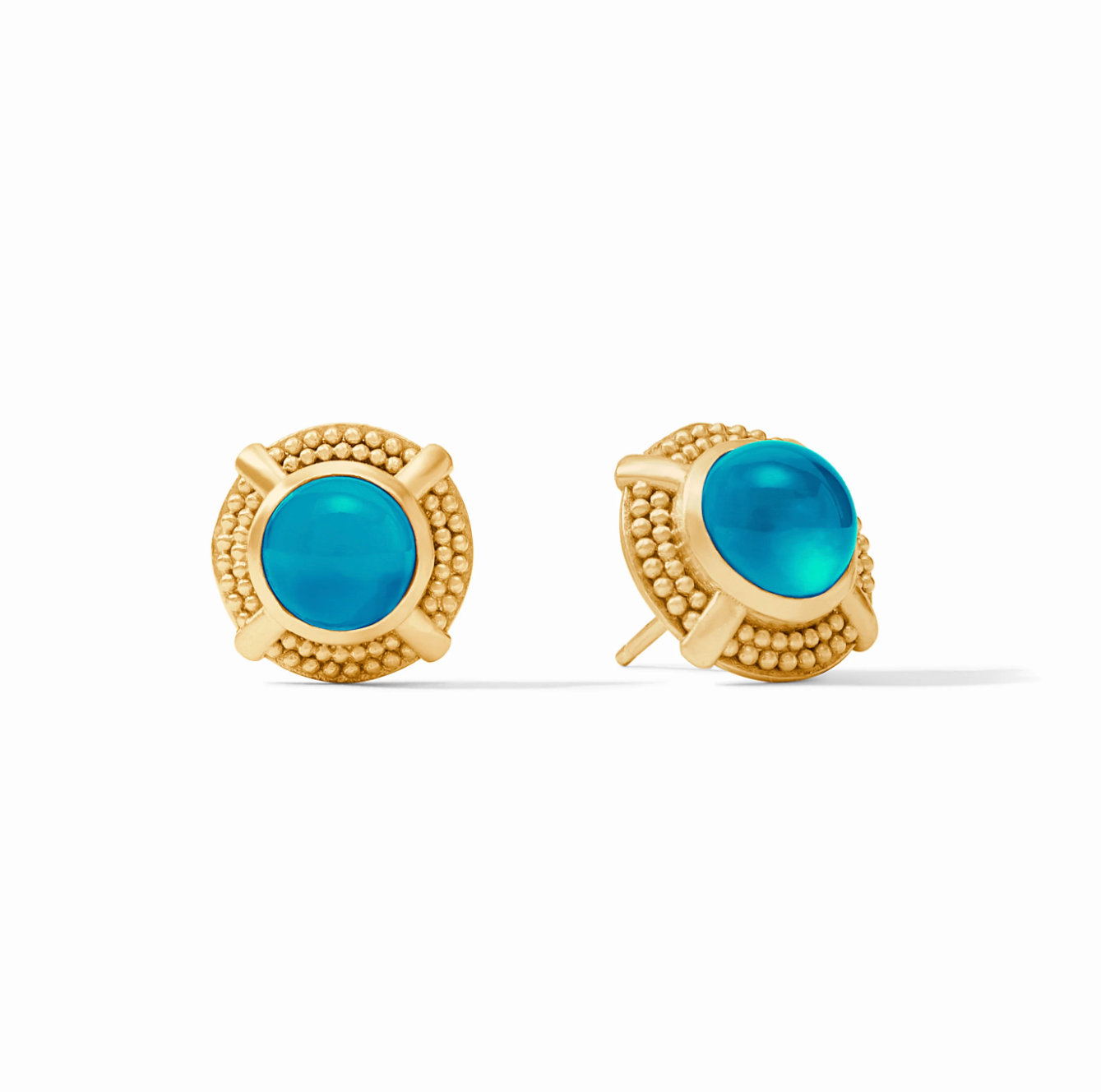 Polished round gemstone studs in a beaded golden setting with an X motif.