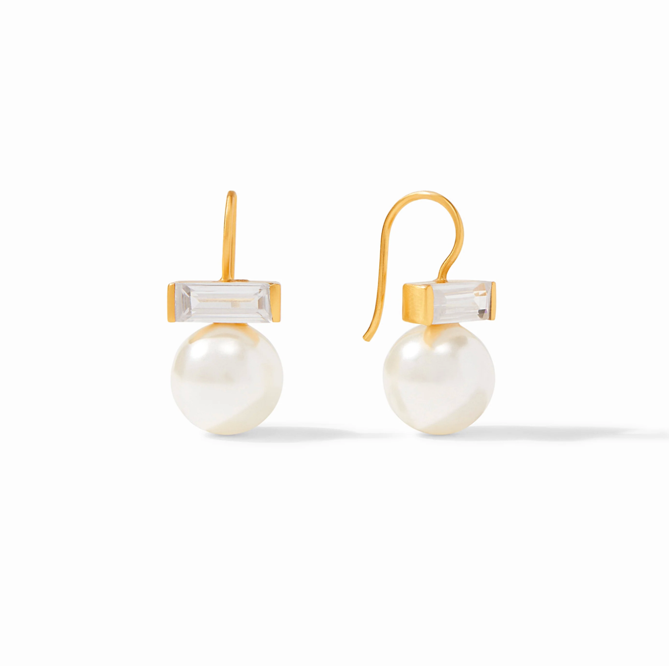 A shimmering CZ baguette sits atop a 12mm shell pearl.