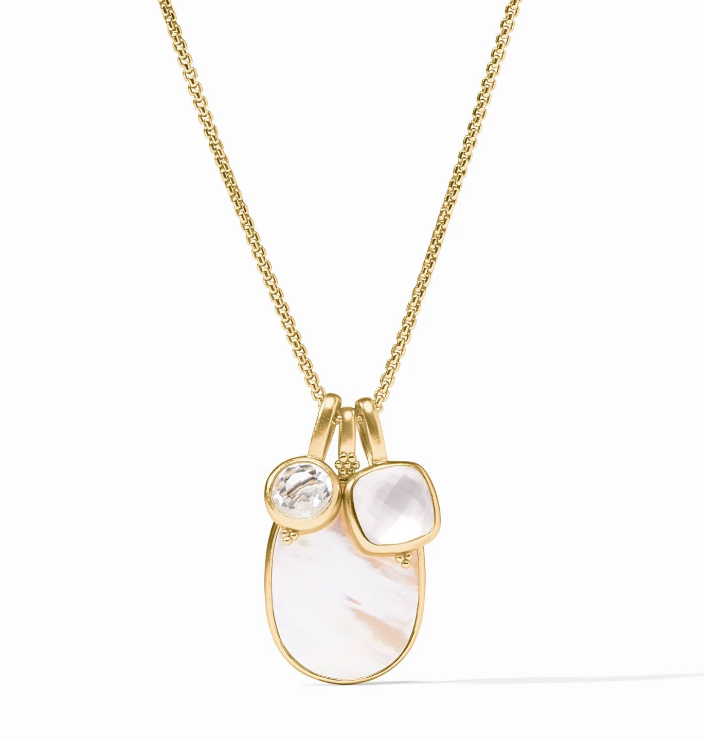 This necklace expertly plays with tone, light, and reflection, with a generous oval mother of pearl plate and two gemstones, one softly iridescent and one sparkling clear, that dance together in the light from a Venetian box chain.