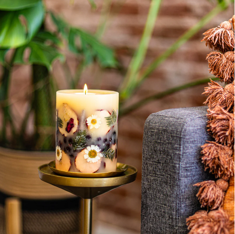 With every botanical element placed carefully by the hands of our candle artisans, these beautifully fragrant candles can take up to 3 days to perfect. During this process each candle is carefully touched 10 different times, from pouring our exclusive wax blend by hand, to lovingly shaping each piece by hand and knife. This artisanal process ensures that the candle appeals to multiple senses by filling your space with fragrance and illuminating botanical elements.