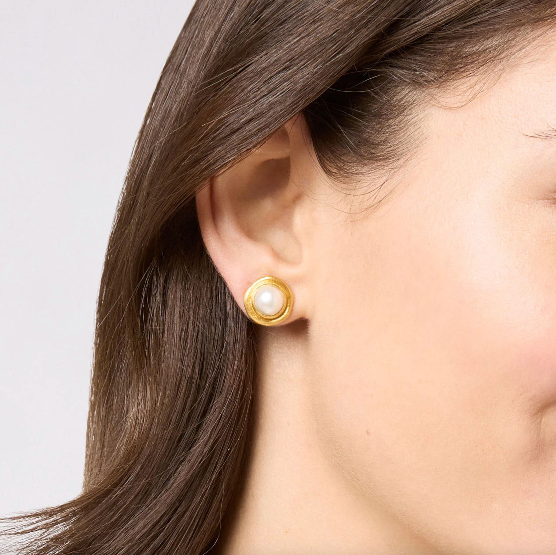 These studs' polished cabochons shimmer within undulating ripples of gold like pebbles piercing still water.